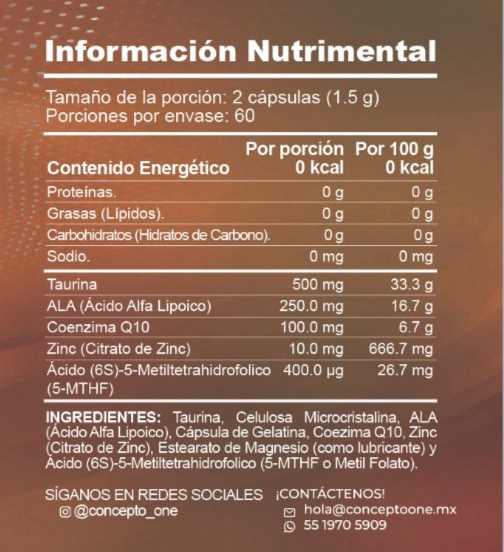 Taurina, ácido alfa lipoico (ALA), coenzima Q10, zinc (citrato de zinc), ácido (6S)-metiltetrahidrofolato (5-MTHF, folato activo).