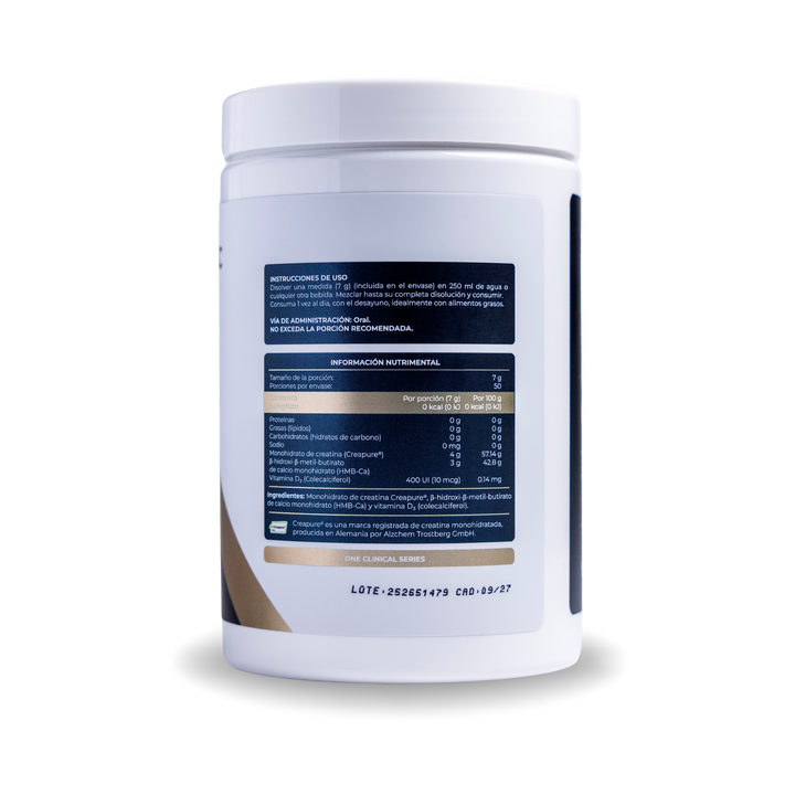 Combina creatina monohidratada Creapure®, HMB-Ca y vitamina D3, ingredientes con evidencia sólida en la preservación de masa muscular, la fuerza y la función física.