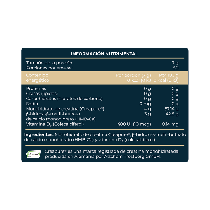 Monohidrato de creatina (Creapure®), β-hidroxi-β-metil-butirato de calcio (HMB-Ca), vitamina D3 (colecalciferol)