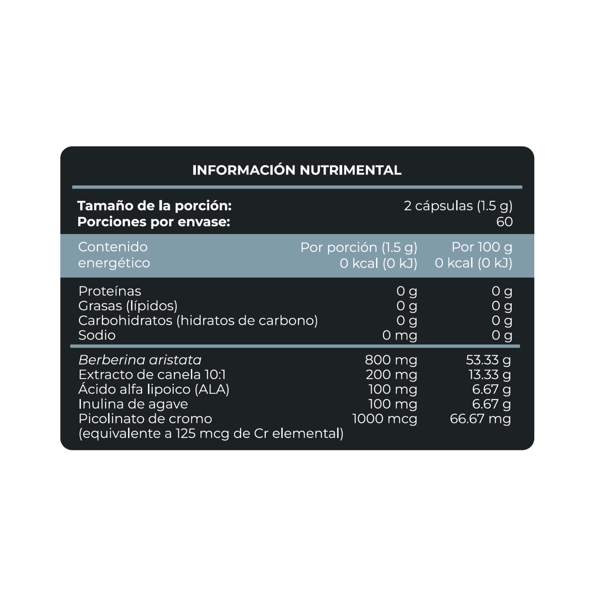 Combina berberina, extracto de canela 10:1, ácido alfa lipoico, inulina de agave y picolinato de cromo, ingredientes ampliamente estudiados en personas con resistencia a la insulina, prediabetes, SOP o acumulación de grasa abdominal.