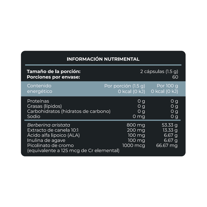 Berberina aristata, extracto de canela 10:1, ácido alfa lipoico (ALA), inulina de agave, picolinato de cromo