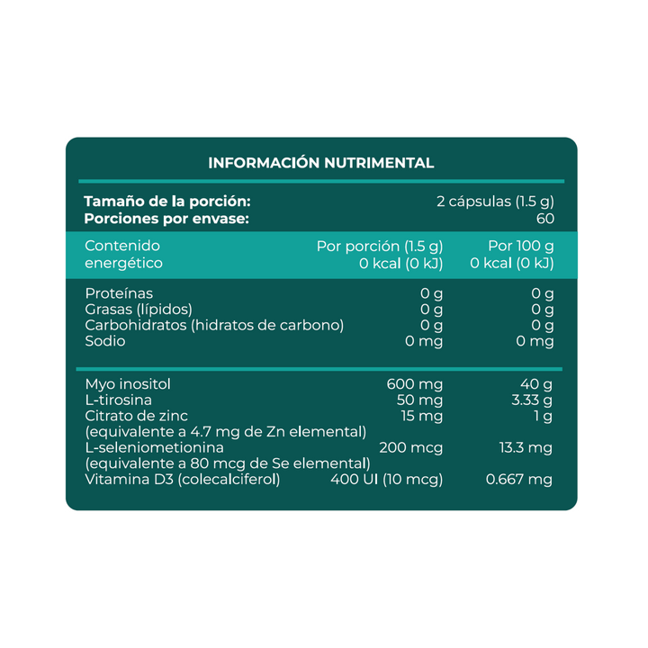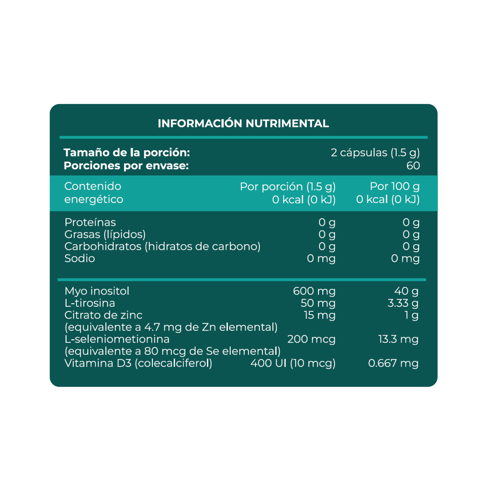 Myo-inositol, L-tirosina, citrato de zinc, L-seleniometionina, vitamina D3 (colecalciferol).