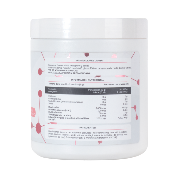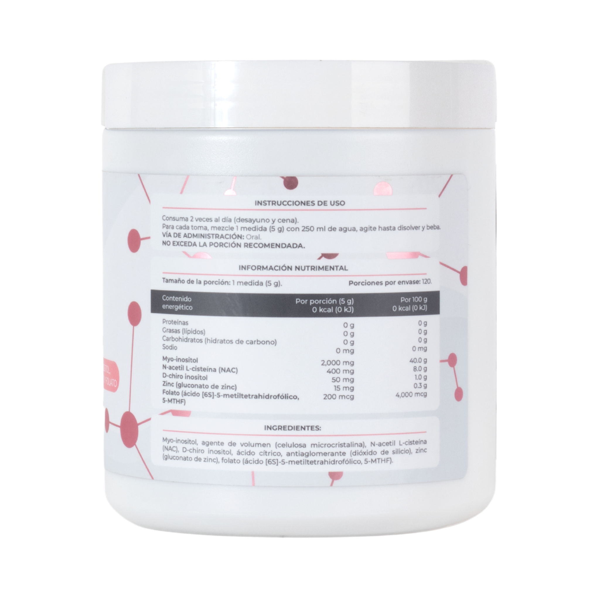 Myo-Inositol, N-acetilcisteína, D-chiro inositol, zinc (citrato de zinc), ácido (6S)-Metiltetrahidrofolato (5-MTHF).