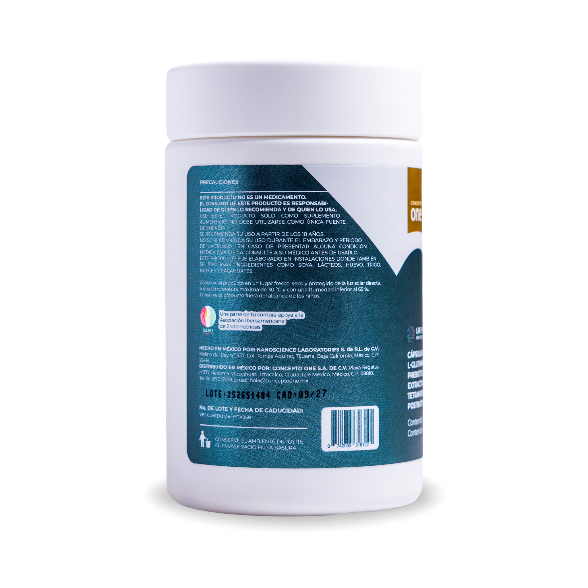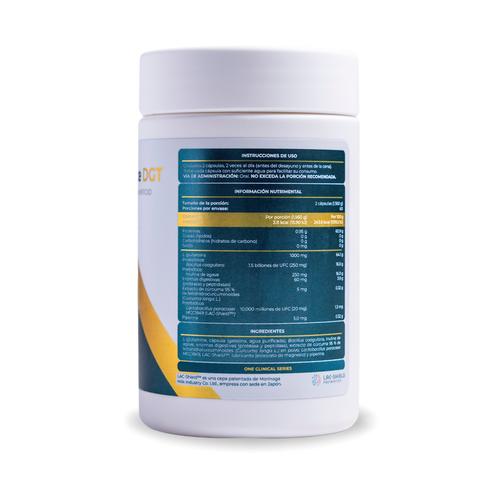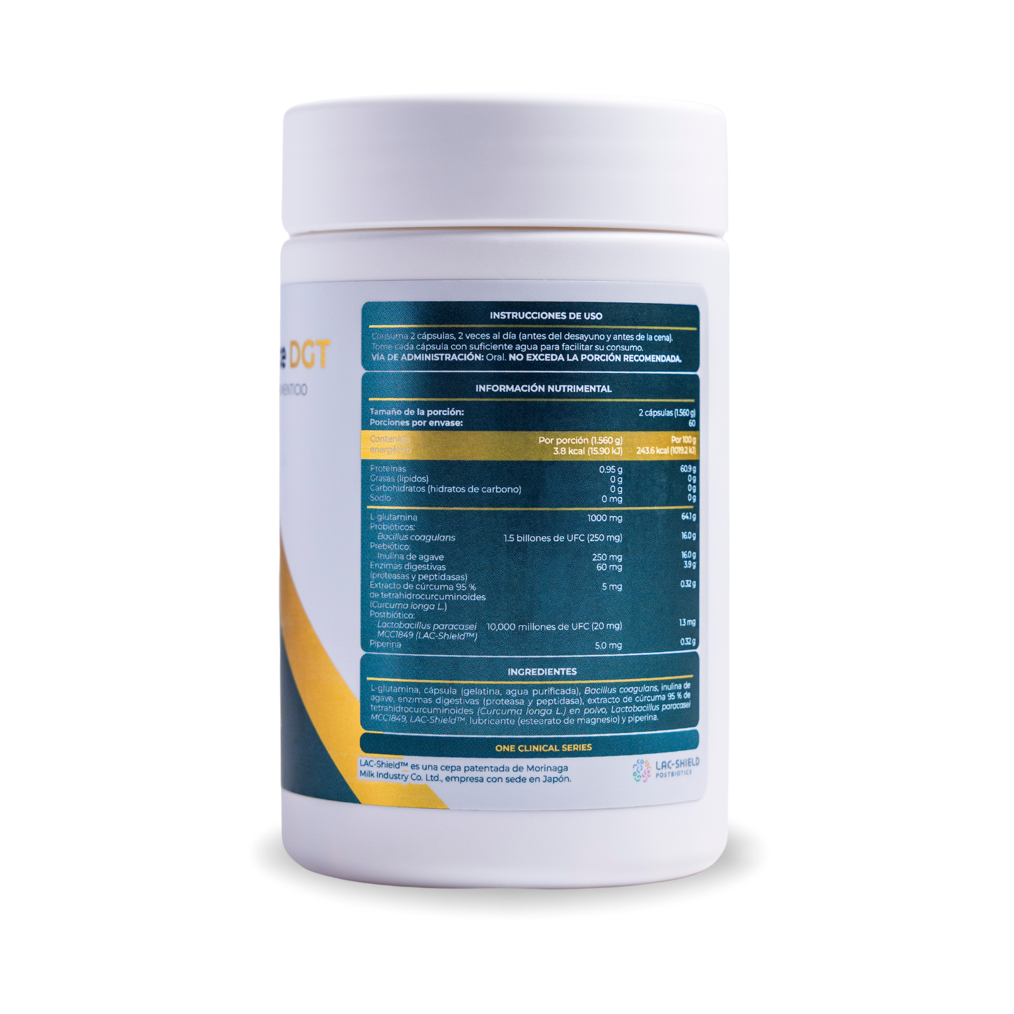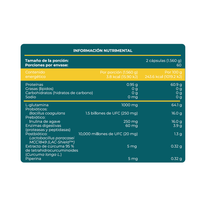 L-glutamina, prébiótico (inulina de agave), probióticos (Bacillus coagulans), postbiótico (Lac-Shield) extracto de cúrcuma 95 % de curcuminoides (Curcuma longa), enzimas (proteasas y peptidasas), piperina.