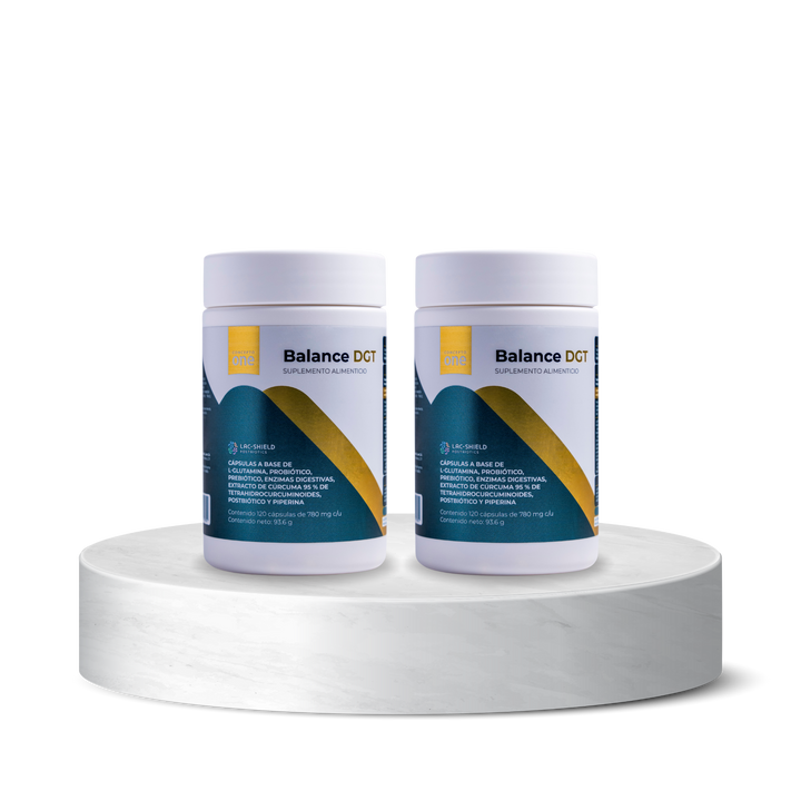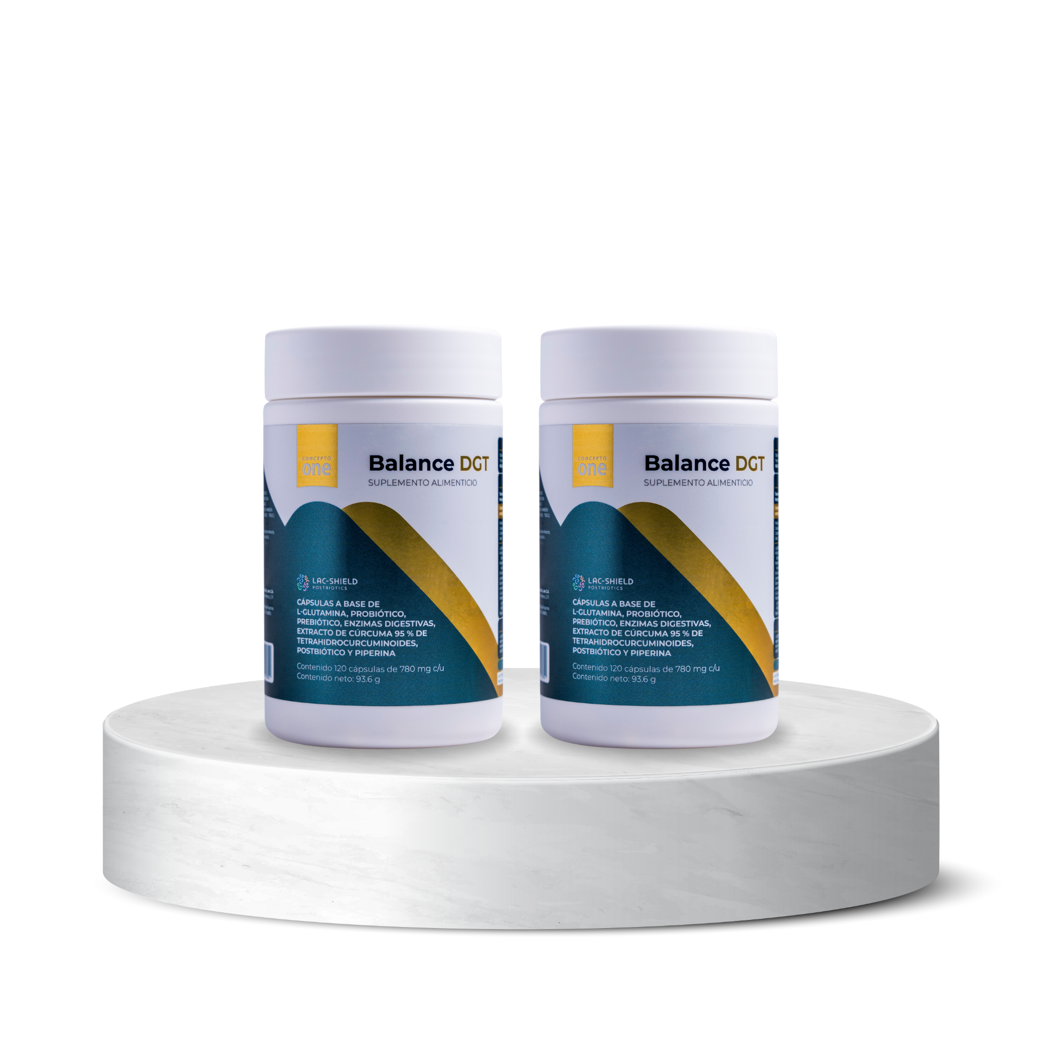 Dos piezas de Balance DGT que apoya la integridad digestiva y es útil en personas con Síndrome de Intestino Irritable (SII). Combinación de glutamina, probióticos, extracto de cúrcuma y enzimas que favorecen la reparación de la mucosa intestinal, la reducción de inflamación y el equilibrio de la microbiota.