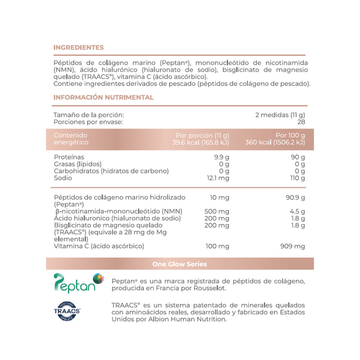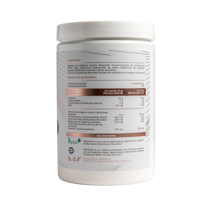 Colágeno Peptan®, NMN (β-nicotinamida mononucleótido), ácido hialurónico, vitamina C, magnesio TRAACS®.
