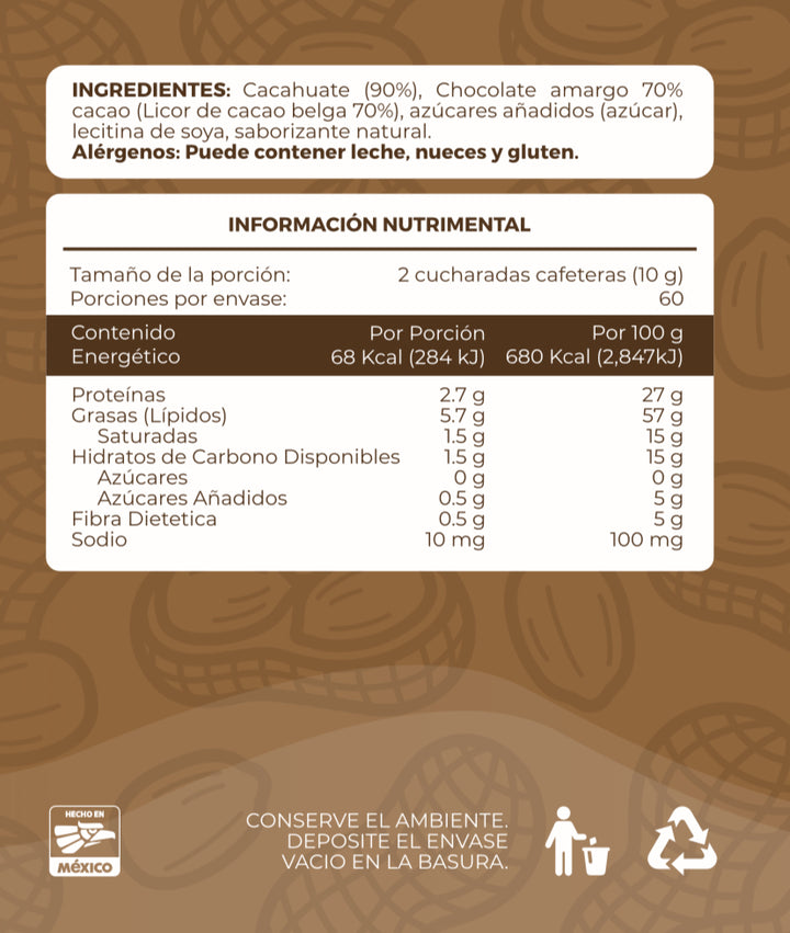 Cacahuate natural tostado (90%), chocolate amargo (70 % cacao), lecitina de soya, saborizante natural.