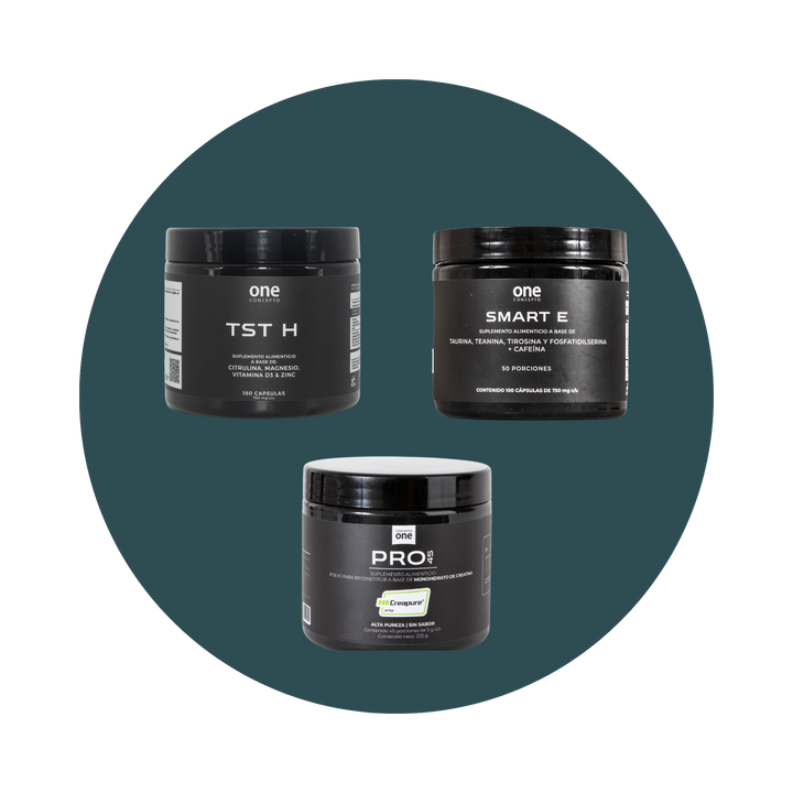 Creatina diaria (5 g), TST H (3 cápsulas) antes de entrenar o de dormir, Smart E (1 a 3 cápsulas) 30–45 min antes del entrenamiento.