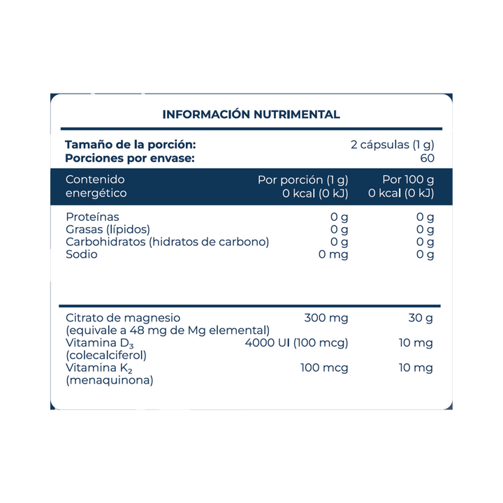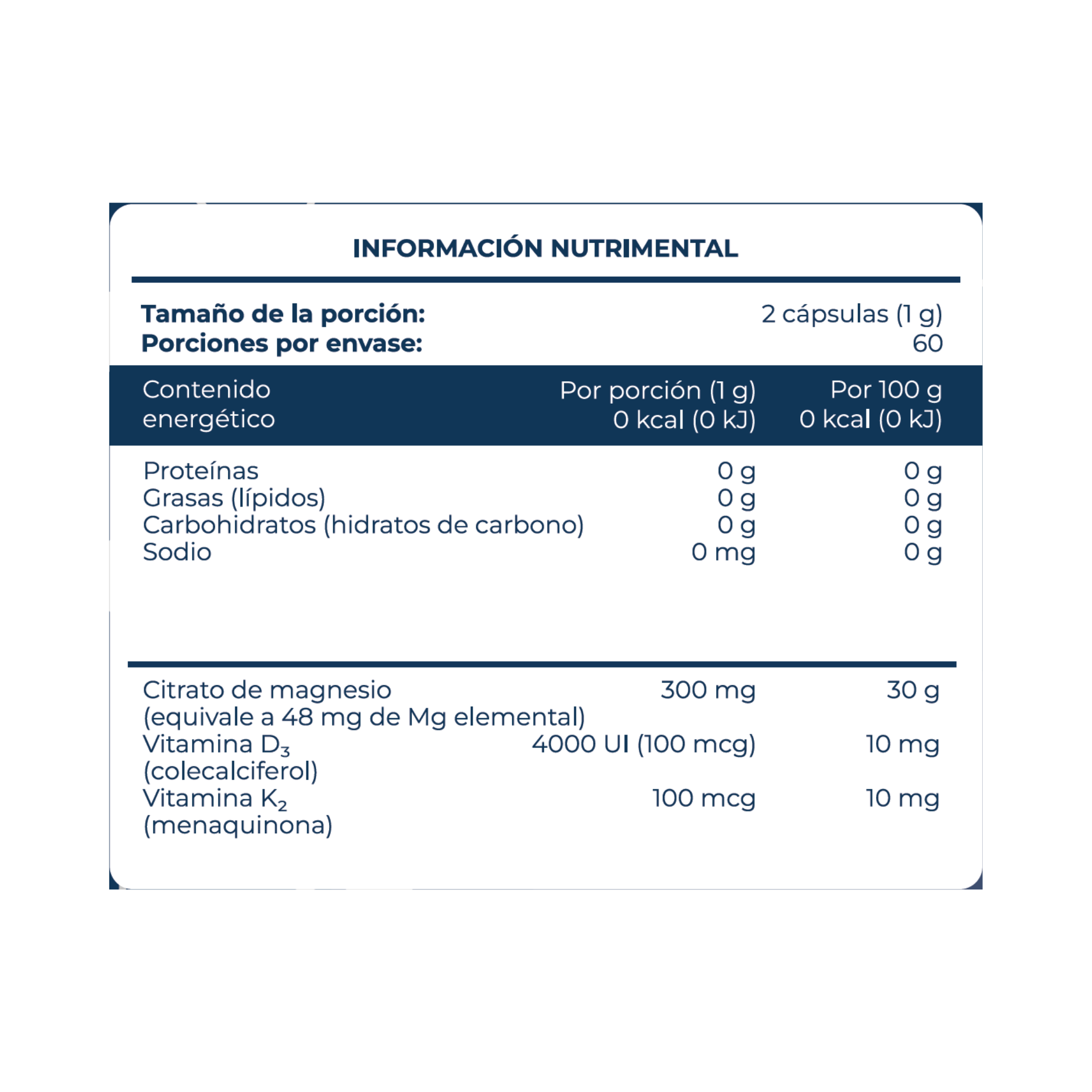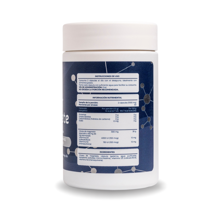 Vitamina D3 (colecalciferol), vitamina K2 (menaquinona), citrato de magnesio.